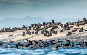 Seal Island Seal Island is a small land mass located 5.7 kilometres off the northern beaches of False Bay, near Cape Town, in South Africa. The island is so named because of the great number of Cape fur seals that occupy it. It is 5 acres in area and home to 64,000 cape fur seals.